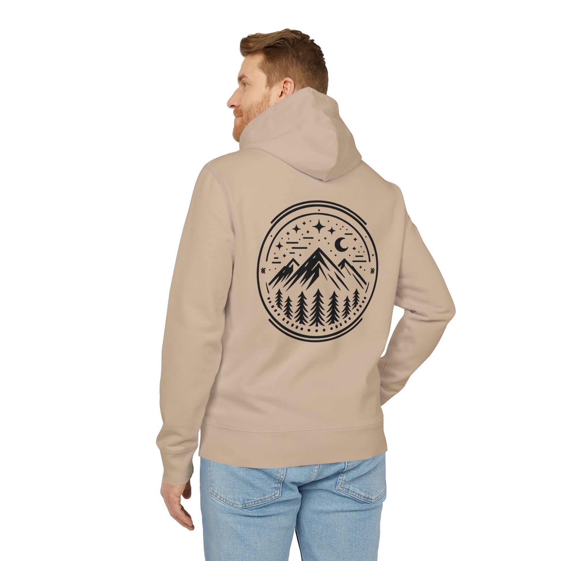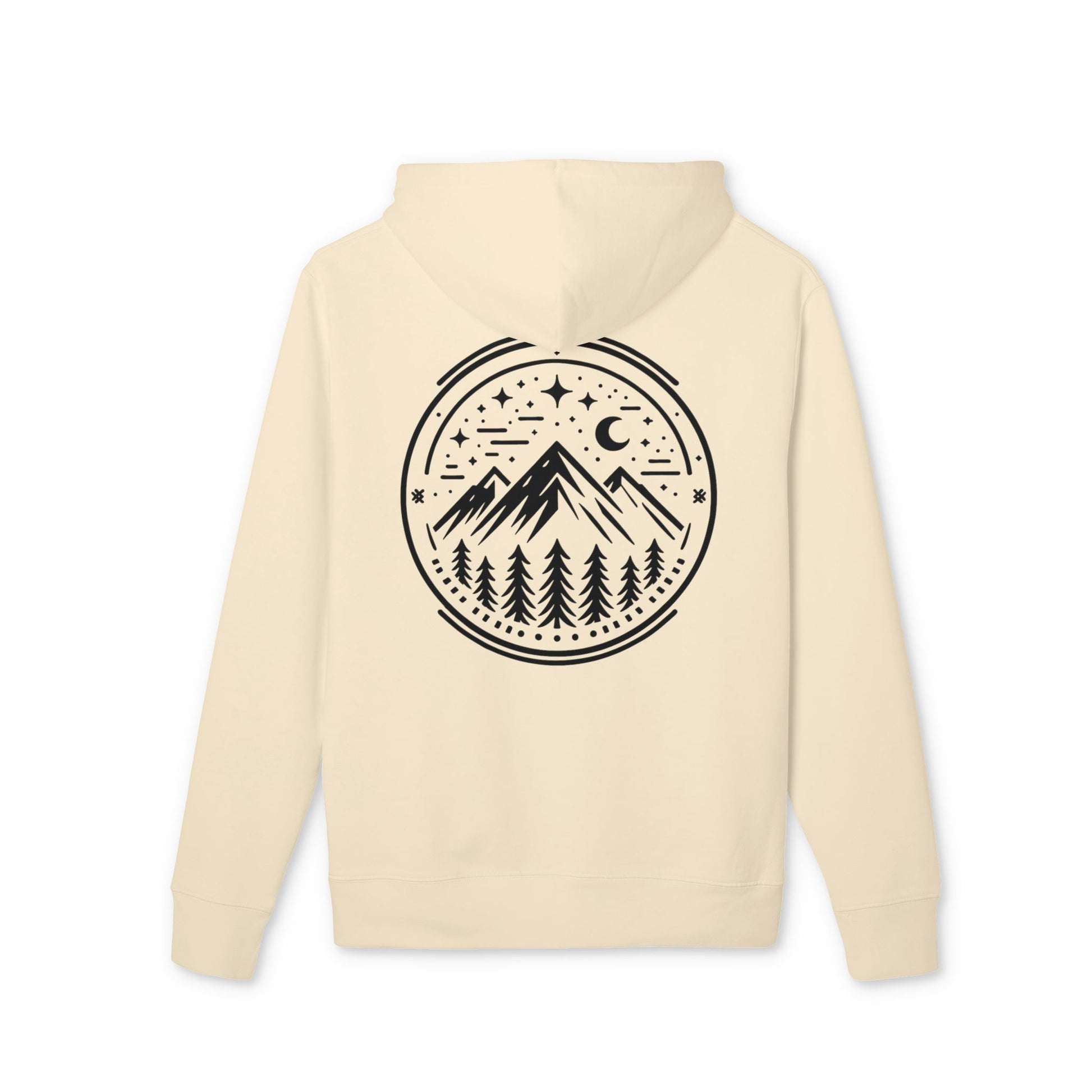 Auf der Rückseite vereint ein cleanes Mountain-Peak-Emblem alles, was du an der Natur liebst: aufragende Gipfel, hohe Tannen, eine schmale Mondsichel und verstreute Sterne – eingefasst in eine minimalistische Rundgrafik. Das Design setzt ein dezentes Statement, ohne den natürlichen Look des Hoodies zu überladen.